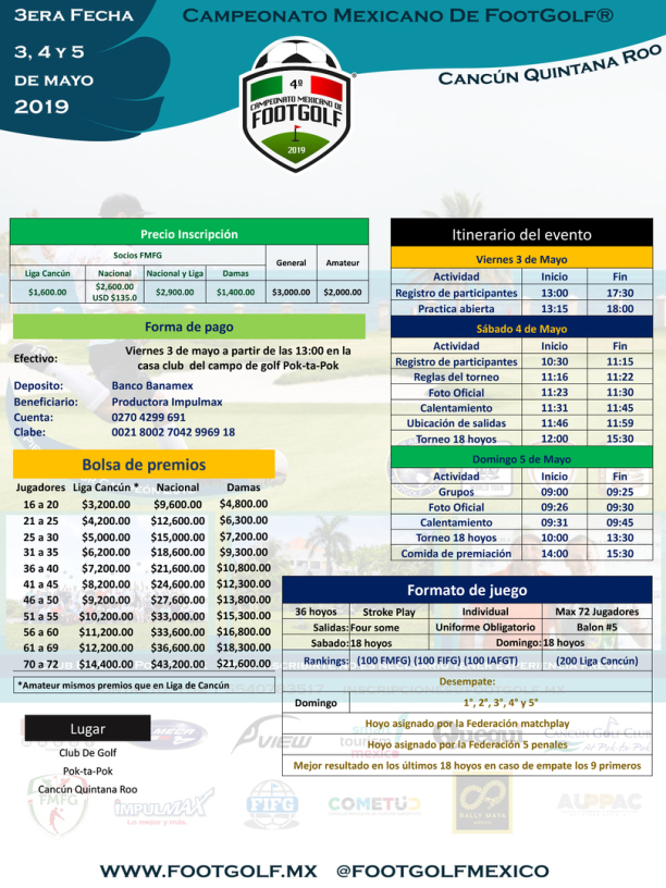 fechas del campeonato cuentan con puntos de ranking para la Región 1 FIFG, en México se juegan 3 fechas del WT (Tour mundial) en marzo Cancún 1000 WT FIFG, en Junio Vallarta 250 WT FIFG, en Julio